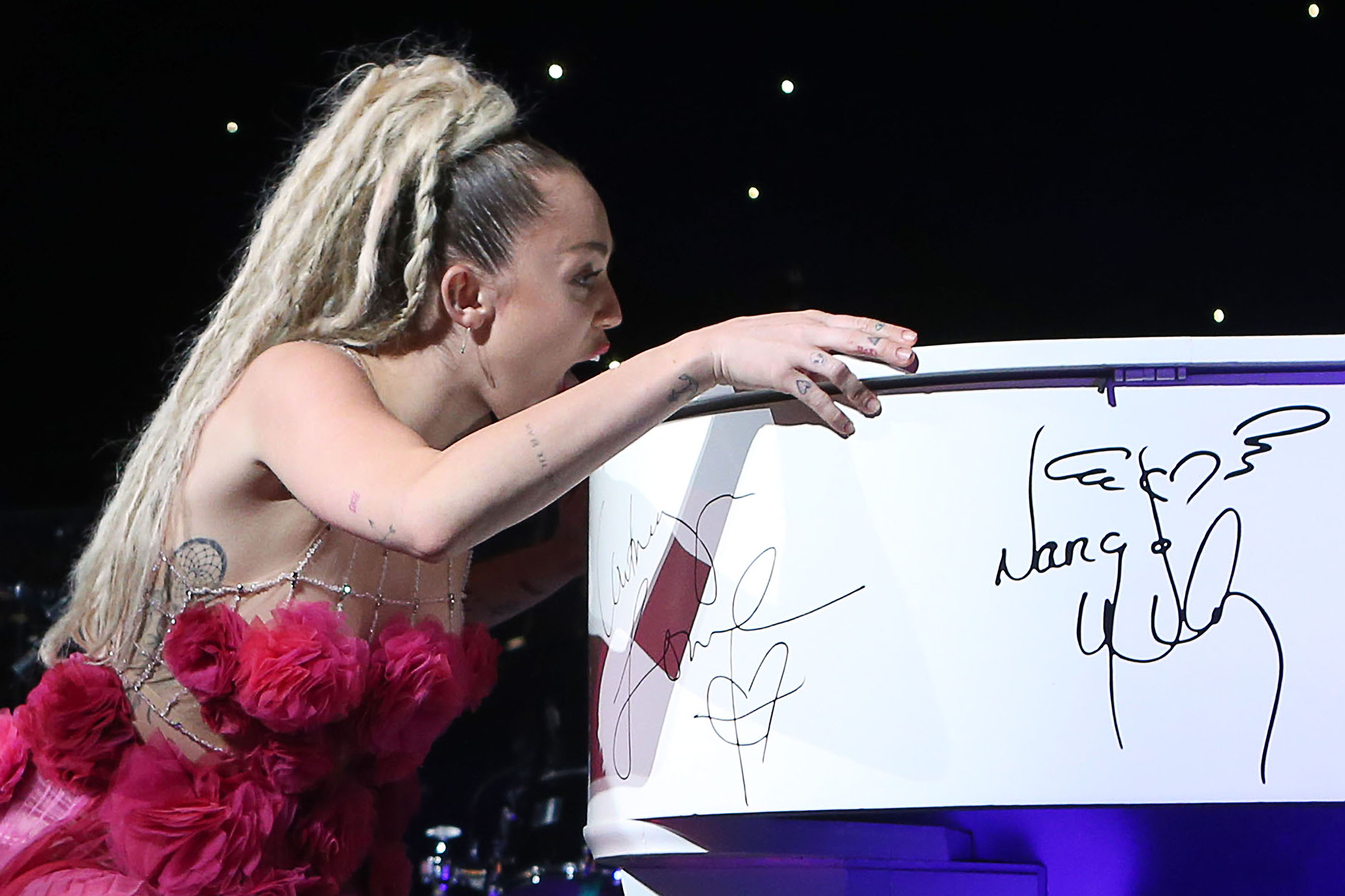 Miley Cyrus îmbrăcată într-o rochie argintie, cântând alături de formație